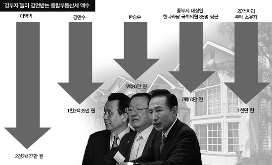 종부세 감면을 해 이명박 자신이 2327만 원의 혜택을 받은 것부터가 그것을 보여 준다. 이명박이 부자에게 감세해준 돈은 총 75조 원이다. 반면 복지예산은 깎기 일쑤여서 심지어 같은 당 초선 의원들조차 이명박식 복지를 비판한다.(관련기사 : “이명박 정부 복지비전 전무” 한나라 초선모임 ‘민본 21’ 발족(<한겨레>)) 이태수 꽃동네현도사회복지대 교수의 비판은 재기있다.