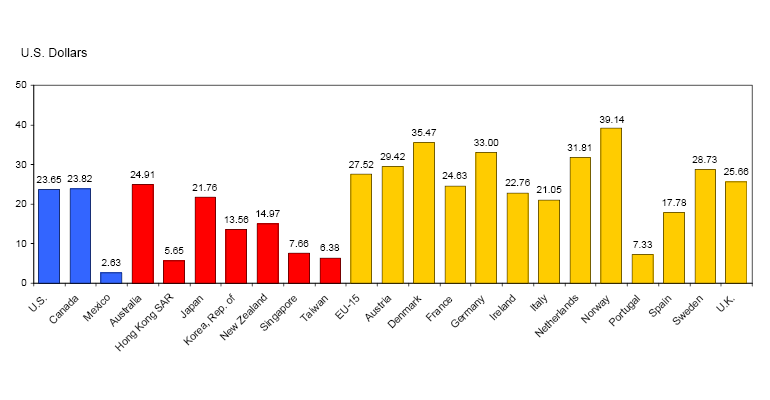 - 100인 이상 사업장 대졸 정규직 신입사원의 평균임금과 미국 파트타임까지 다 포함한 것을 비교하면 안 된다.
