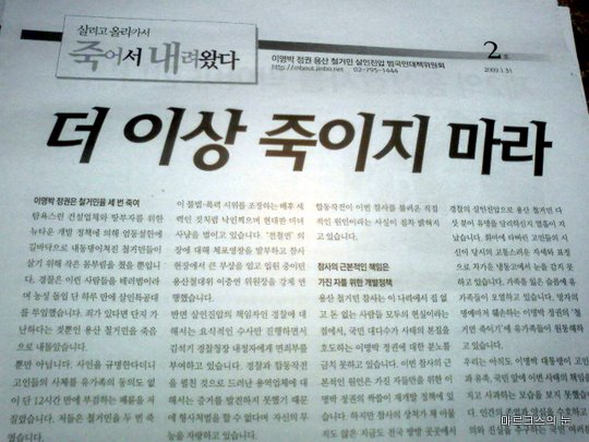 그러나, 너무 지나쳤던 게지. 앞서 말한 이 노조 활동가는 용산참사가 터지자마자 현대중공업 미포만 굴뚝농성에 들어간 사람들 문제가 거의 100% 해결됐다고 말하며, 분명 용산참사와 굴뚝 농성이 맞물리기를 원치 않아 그런 합의를 해 준 것이라 거라고 말했다. 처참한 두 투쟁… 돌아가신 철거민 열사들은 그래도 미포만 굴뚝에 오른 두 생명을 살렸다. 청와대에 앉은 쥐새끼가 수없이 많은 사람을 살해할 동안.