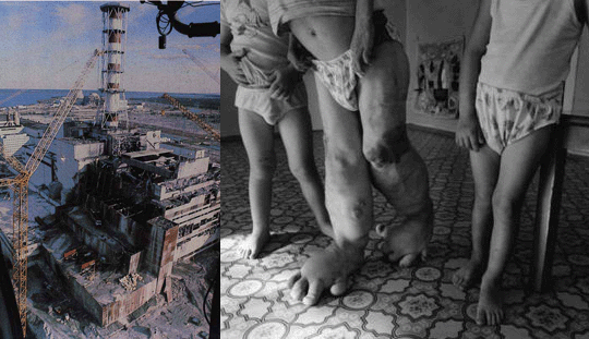 (좌)체르노빌 폭발 현장 (우)체르노빌 사고로 인한 기형아들 (출처: mahalo.com)